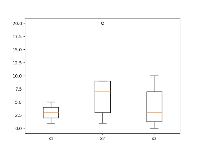 从运行结果可以看出,x2数据有一个异常数据点,绘制在箱线图外部。