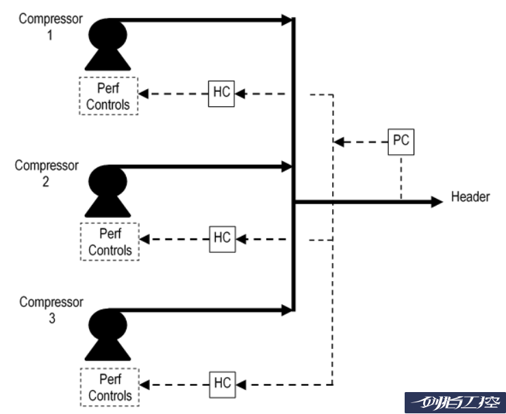 压力控制器 (PC)调整所有处于自动模式偏置控制器 (HC)。通过将 偏置控制器 (HC)置于手动模式,可以将单个压缩机与压力控制器 (PC)断开并进行基本加载。