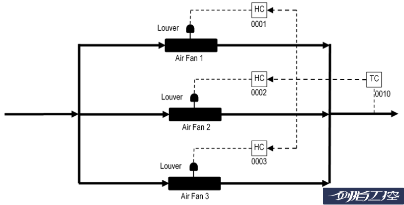图3展示了多个风扇热交换器的控制方案。每个风扇百叶均由偏置控制器 (HC)调节,偏置控制器 (HC)对温度控制器 (TC)输出施加偏置并将结果发送到百叶。该偏置允许百叶之间处于不同的位置。此功能对于补偿不同冷却程度的风扇是必要的。例如,对于冷却效果略差的风扇,可以增加偏置量。