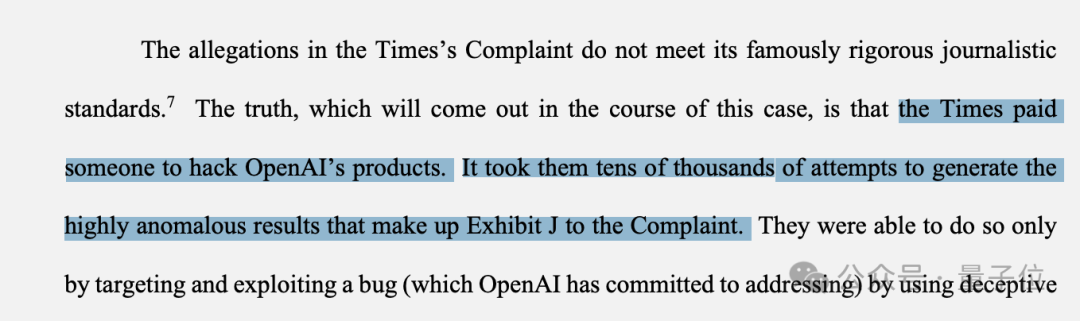 OpenAI指责《纽约时报》故意误导法庭,“使用省略号来掩盖”ChatGPT吐出报道片段的顺序,造成了“ChatGPT生成了文章的连续和不间断片段的错误印象”。