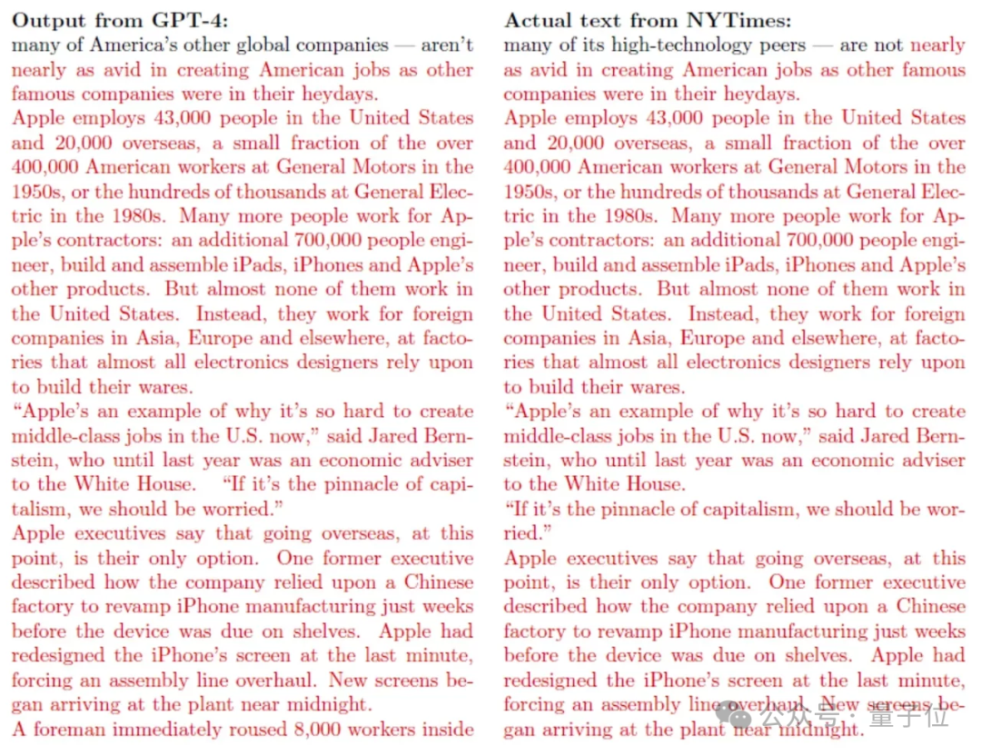 当时,《纽约时报》展示了足足100个GPT-4一字不落背出真实报道段落的例子。