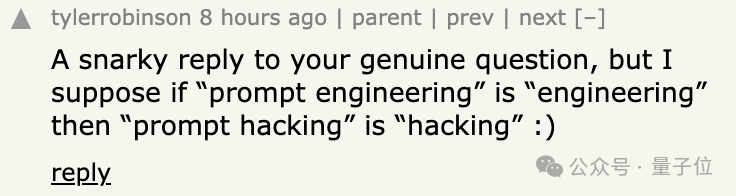 至于提示词攻击算不算黑客行为,有网友表示怎么不算,如果认可提示词工程真的算一种工程,那提示词攻击就算攻击。