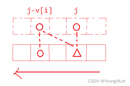 我们可以观察到,三角形所在的位置只需要依赖第 j 个位置和第 j - v[i] 个位置,所以我们可以大胆把横坐标去掉,只需要一个维度的坐标即可,这种方法叫做滚动数组;但是我们要注意,遍历顺序需要从右往左,如下图: