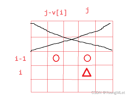 根据状态转移方程,我们更新当前 dp 表位置的时候,只需要用到 i - 1 行中的第 j 个位置和第 j - v[i] 个位置,如下图,三角形是我们需要更新的位置,我们只需要两个圆圈的位置: