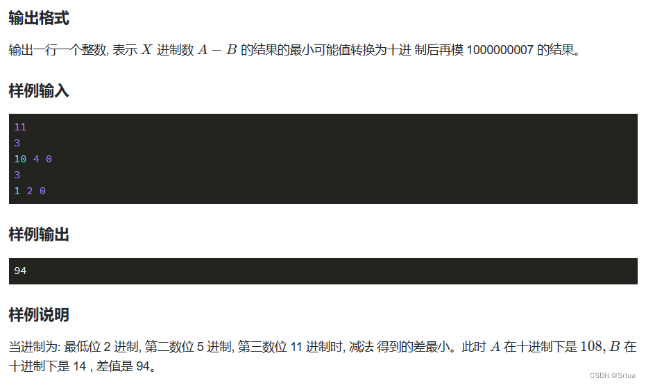 ret = (ret+(numsA[i] - numsB[i]) * base)%MOD;