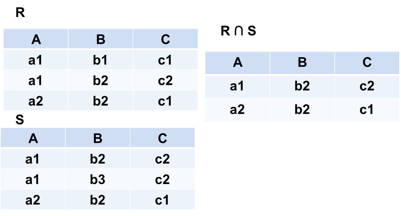 R∩S仍为n目关系,由既属于R又属于S的元组组成 R∩S = { t|t ∈R∧t ∈S } 【R∩S = R –(R-S)】