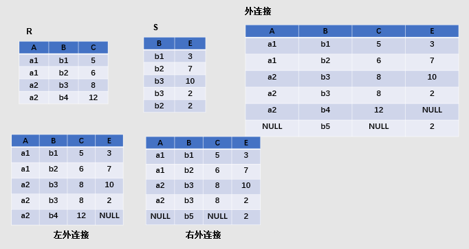 两个关系中相同的属性组联合 3.3 外连接:把悬浮元组也保存在结果关系中,而在其他属性上填空值(Null) 3.4 左外连接:只保留左边关系R中的悬浮元组 3.5 右外连接:只保留右边关系S中的悬浮元组