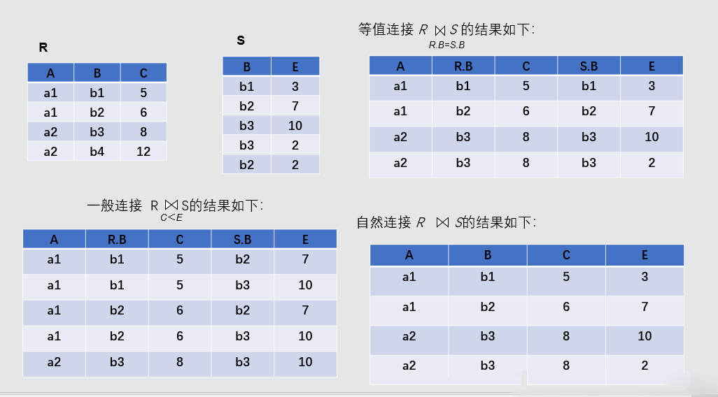A和B:分别为R和S上度数相等且可比的属性组;θ:比较运算符 1. 连接分成 等值连接+自然连接 等值连接 θ为“=”的连接运算称为等值连接