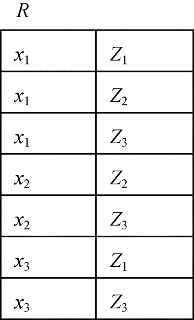 给定关系R (X,Y) 和S (Y,Z),其中X,Y,Z为属性组。 R中的Y与S中的Y可以有不同的属性名,但必须出自相同的域集。 R与S的除运算得到一个新的关系P(X), P是R中满足下列条件的元组在 X 属性列上的投影: 元组在X上分量值x的象集Yx包含S在Y上投影的集合,记作: R÷S={tr[X] | tr∈R∧πY(S)∈Yx} Yx:x在R中的象集,x = tr[X] 示例