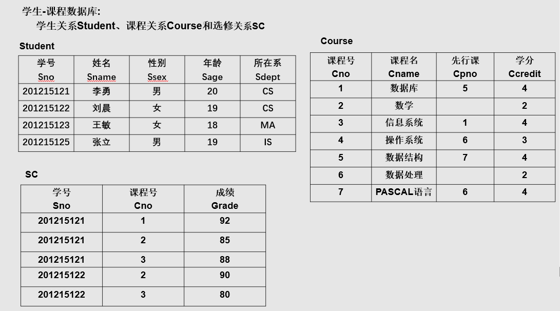 从R中选择出若干属性列组成新的关系 πA(R) = { t[A] | t ∈R } ,A:R中的属性列 示例: 查询学生的姓名和所在系。 即求Student关系上学生姓名和所在系两个属性上的投影 πSname,Sdept(Student) Sname Sdept 李勇 CS 刘晨 CS 王敏 MA 张立 IS 查询学生关系Student中都有哪些系。 πSdept(Student) Sdept CS IS MA