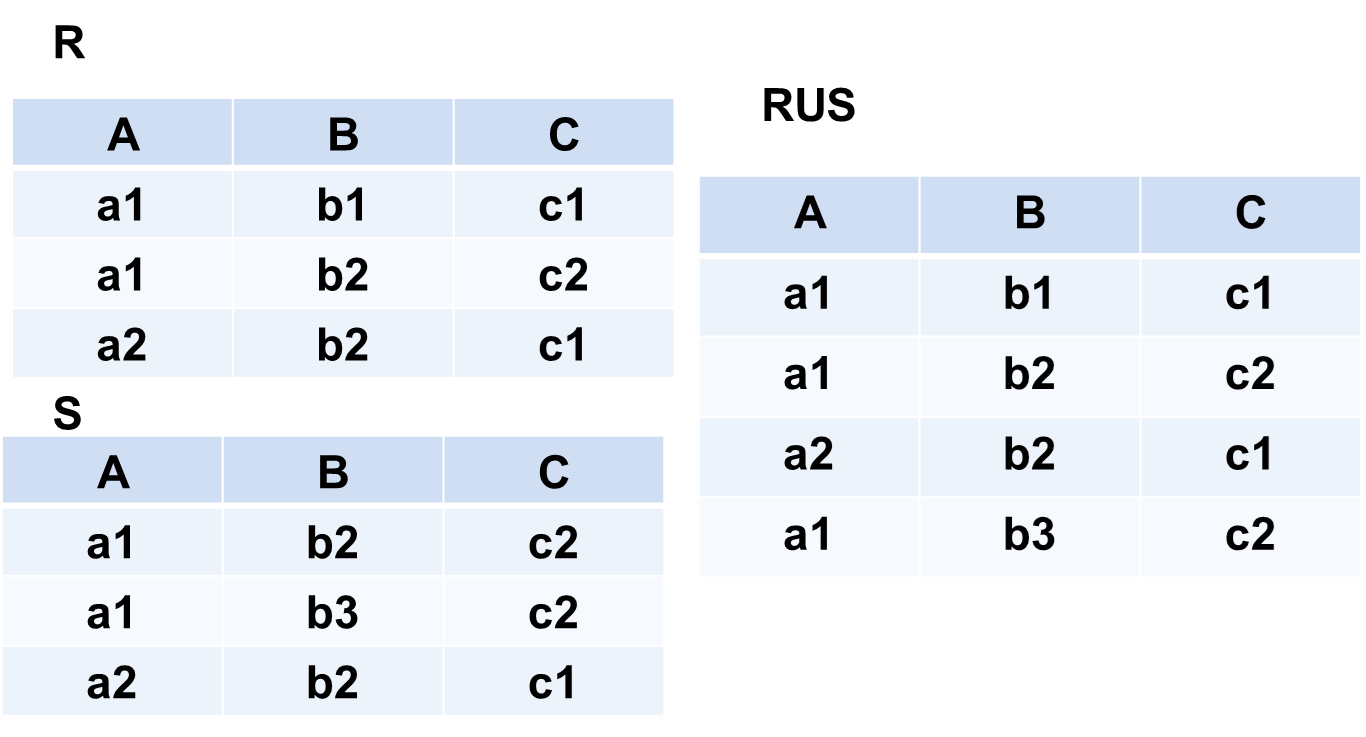 R∪S 仍为n目关系,由属于R或属于S的元组组成 R∪S = { t|t ∈ R∨t ∈S }