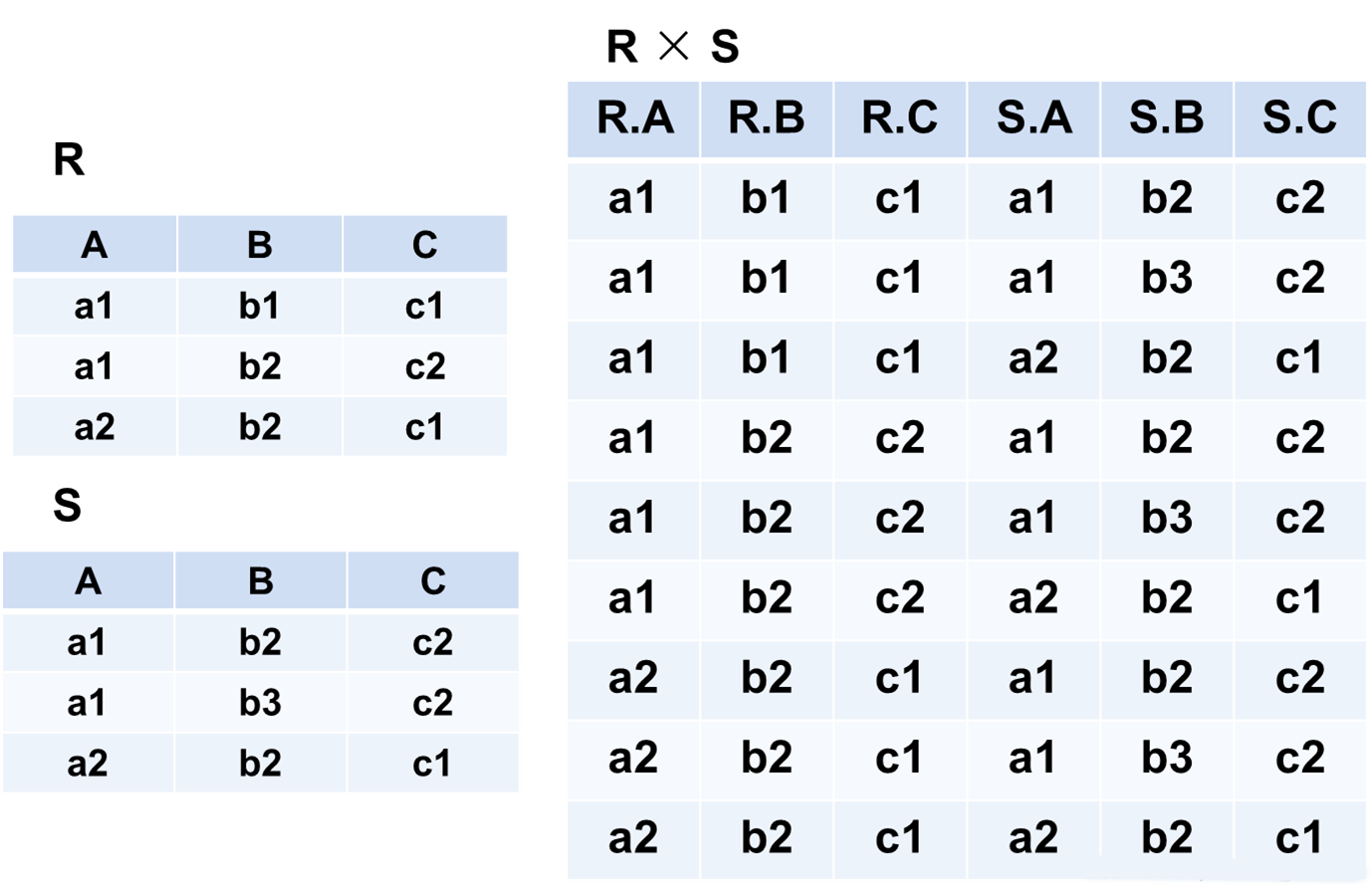 R×S 列:(n+m)列元组的集合,元组的前n列是关系R的一个元组,后m列是关系S的一个元组 行:k1×k2个元组 R×S = {tr ts |tr ∈R ∧ ts∈S }