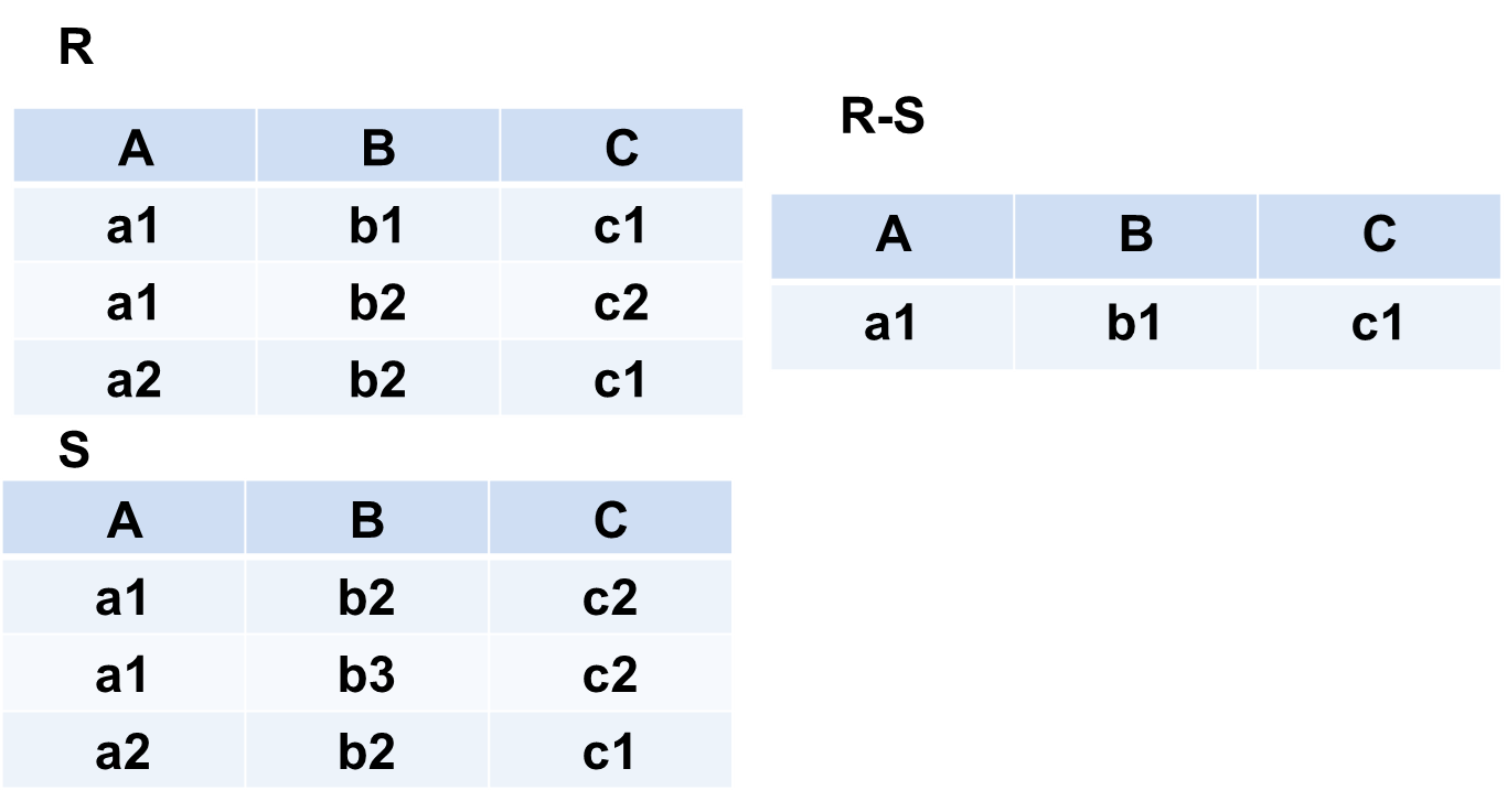 R - S 仍为n目关系,由属于R而不属于S的所有元组组成 R -S = { t|t∈R∧t∈S }