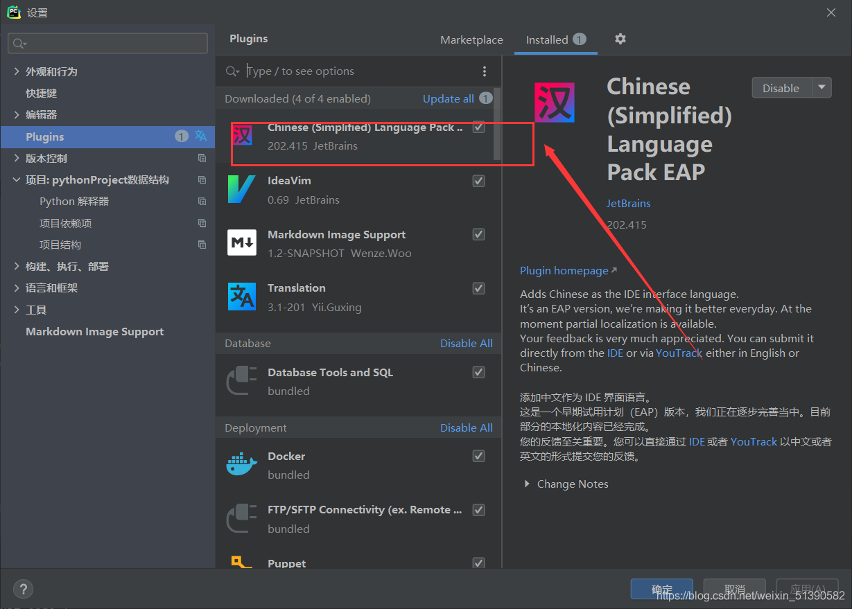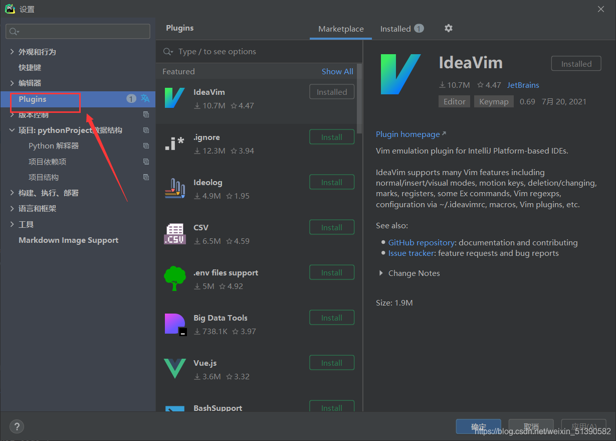 然后在里面找到Plugins这一选项,这是pycharm中自带的一些插件,我们可以根据需求来进行安装和使用。
