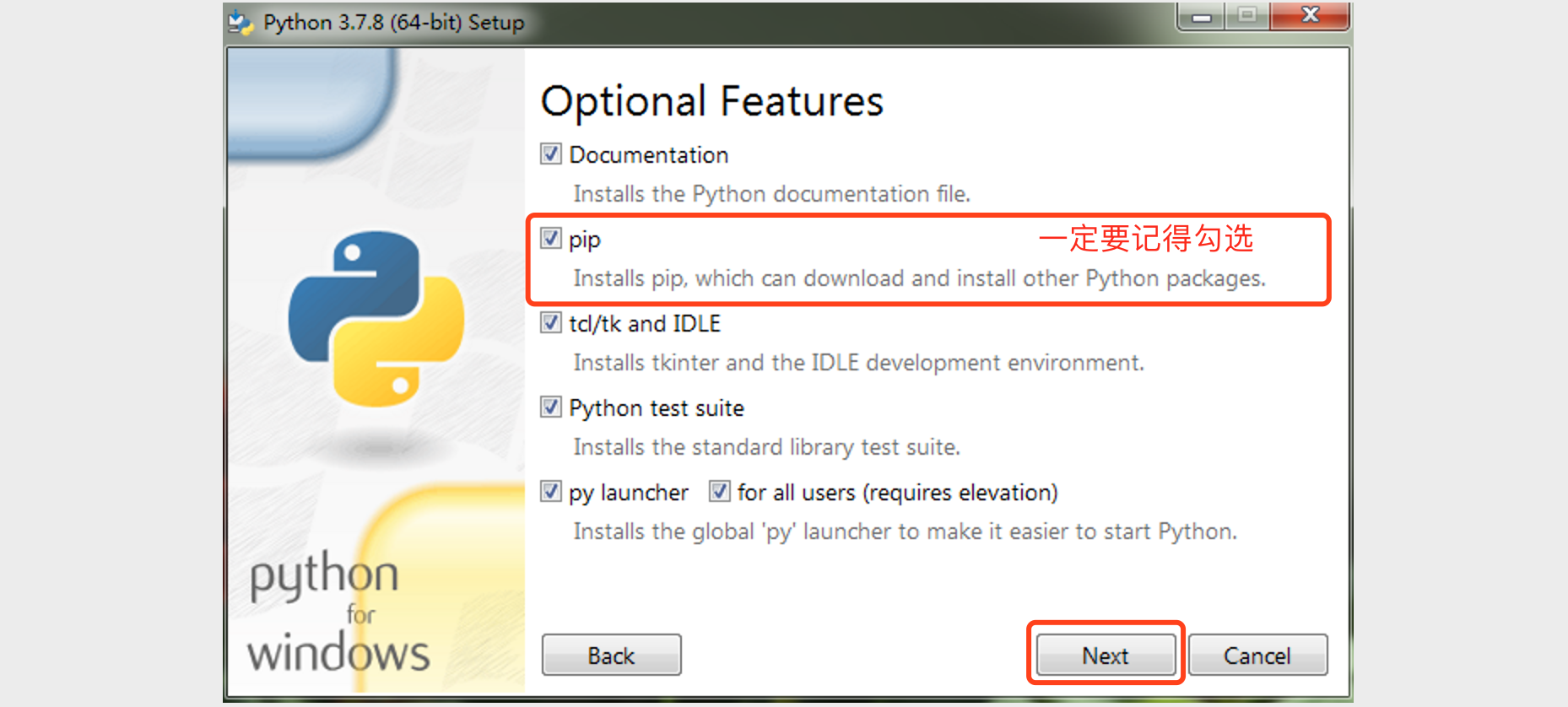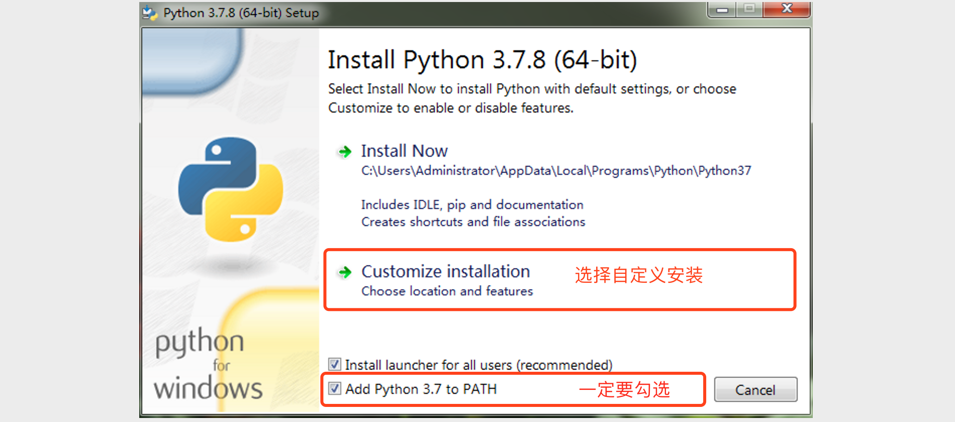 双击运行刚才下载的安装程序,会打开Python环境的安装向导。在执行安装向导的时候,记得勾选“Add Python 3.x to PATH”选项,这个选项会帮助我们将Python的解释器添加到PATH环境变量中(不理解没关系,照做就行),具体的步骤如下图所示。