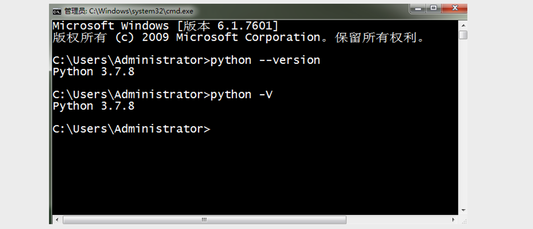 安装完成后可以打开Windows的“命令行提示符”工具(或“PowerShell”)并输入python --version或python -V来检查安装是否成功,命令行提示符可以在“运行”中输入cmd来打开或者在“开始菜单”的附件中找到它。如果看了Python解释器对应的版本号(如:Python 3.7.8),说明你的安装已经成功了,如下图所示。
