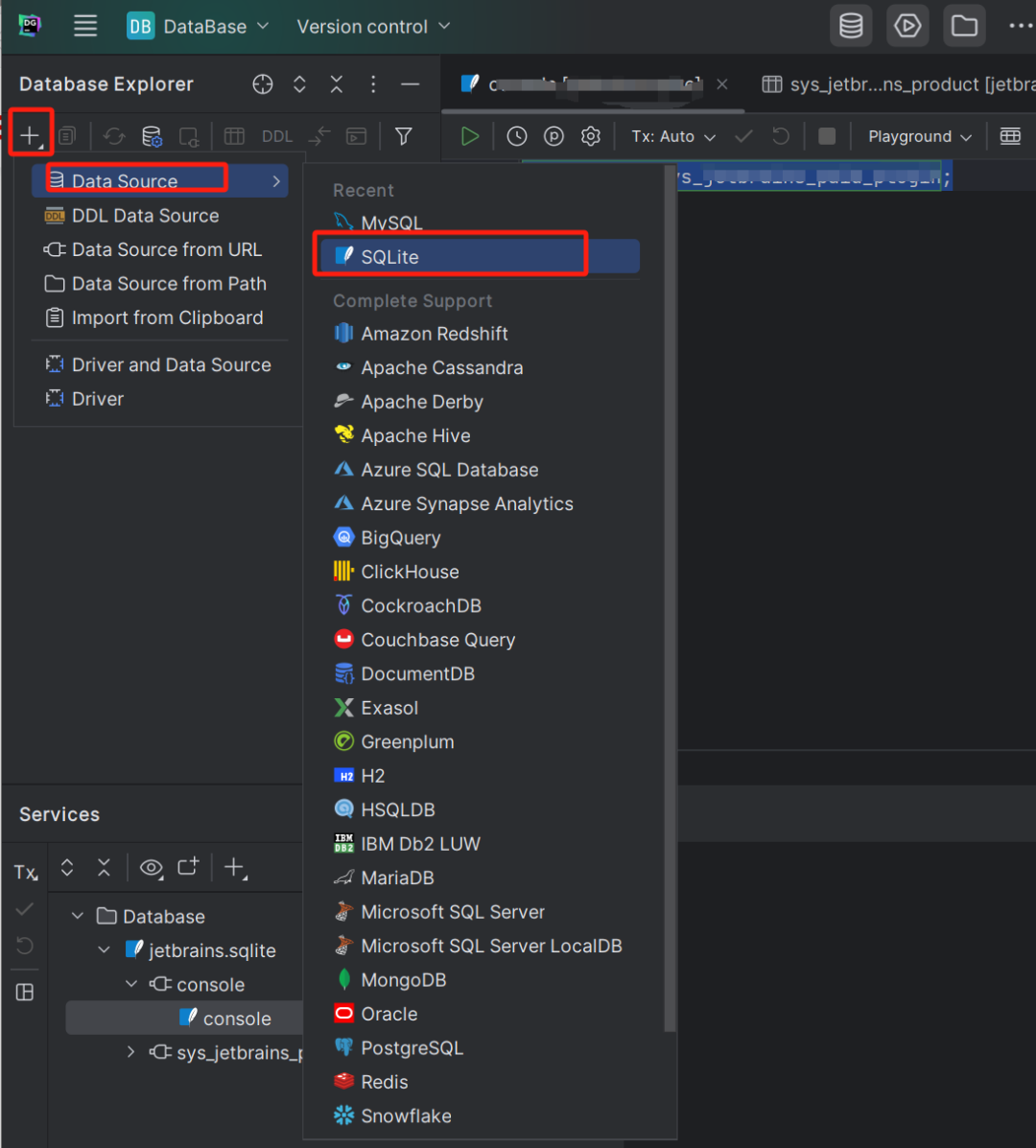 打开DataGrip,点击左上角的+,在下拉选项中选择DataSource,再找到SQLite。