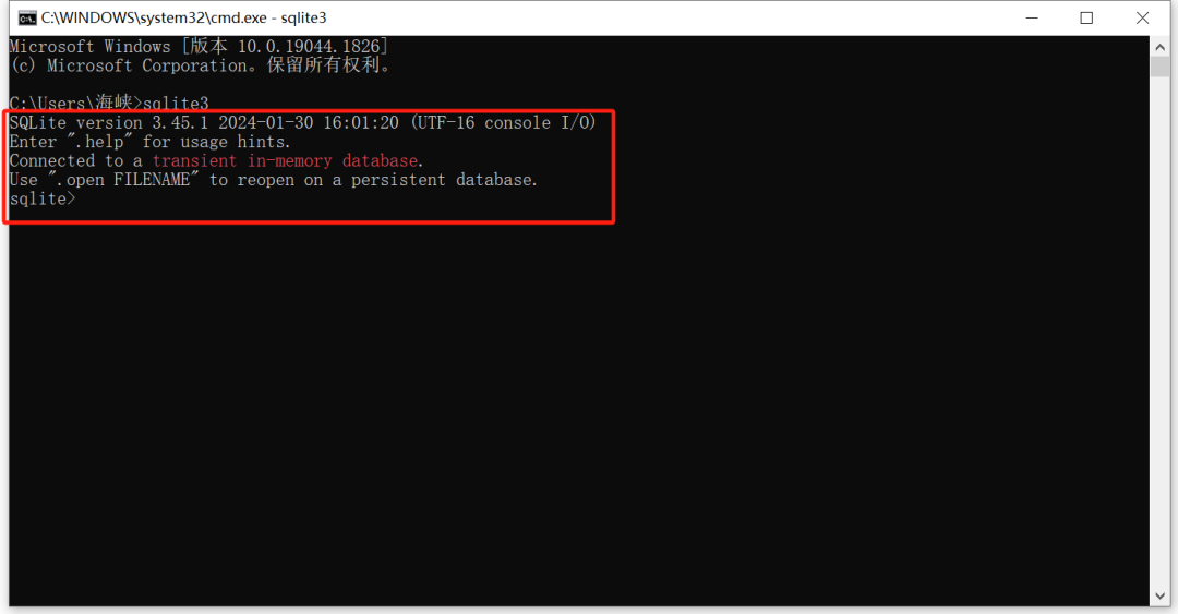 之后,可以打开cmd窗口,切换到任意目录,输入sqlite3,出现如下提示信息表示系统环境变量配置成功。