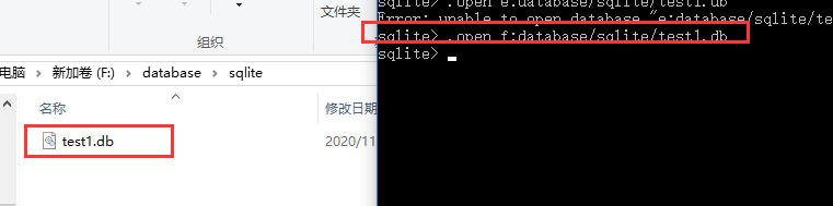 在当前sqlite下,输入 .open f:database/sqlite/test1.db,可在F:/database/sqlite路径下创建数据库test1