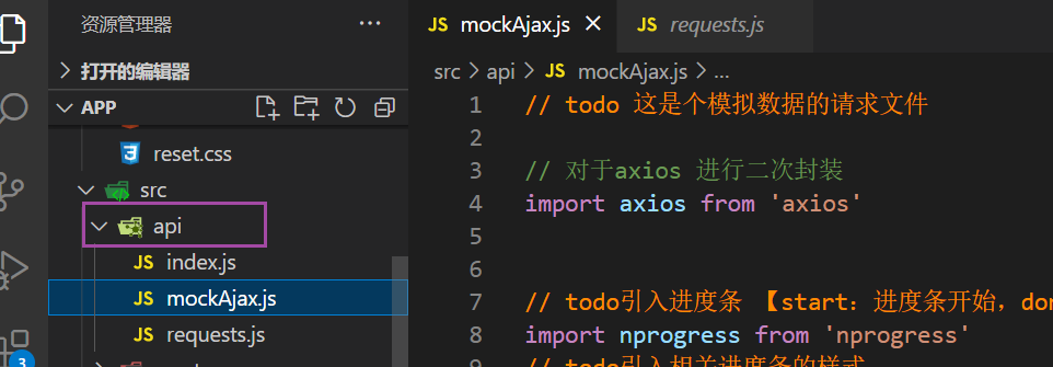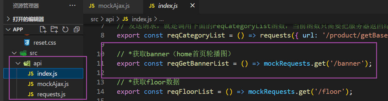 Mock.mock('/mock/banner', { code: 200, data: banner })在请求数据文件夹api下创建mock模拟数据请求文件,这个文件请求代码放在下面了