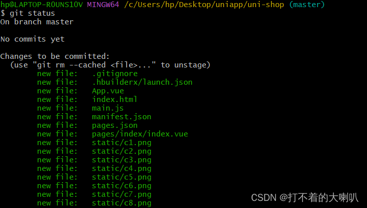 如果没有提示,或者只有一些无用的警告,证明设置成功,然后执行下面命令,查看页面状态,出现一堆绿色文字,证明已经将所有文件都加入到暂存区