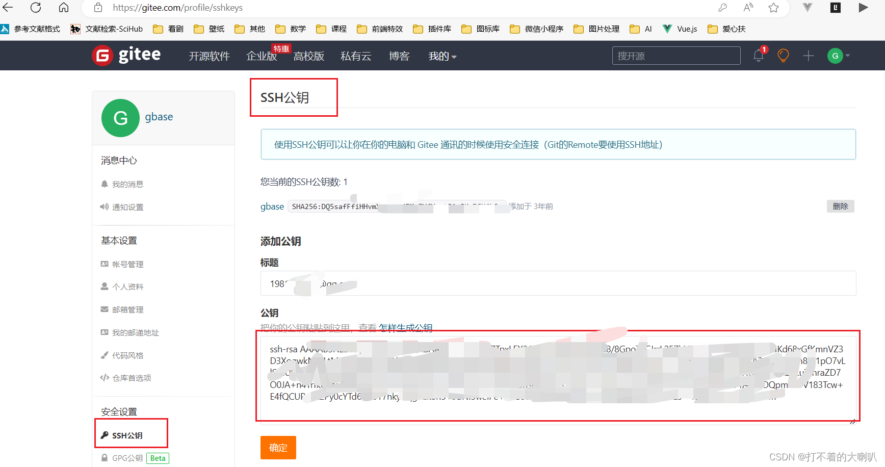 在上面,可能别的博客直接三个回车就行,我的不行,注意框框的内容,是这个就的在后面加上自己的路径,注意:可能你users文件夹下面不是hp,还是看看你自己的是什么 然后复制密钥到码云 地址:SSH公钥 - Gitee.com