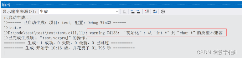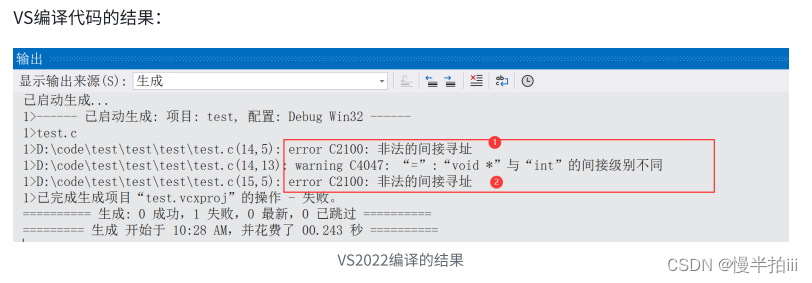 }在上⾯的代码中,将⼀个 int类型的变量的地址赋值给⼀个 char*类型的指针变量。编译器给出了⼀个警告(如下图),是因为类型不兼容。而使用 void* 类型就不会有这样的问题。