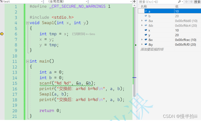 我们发现其实没产⽣交换的效果,这是为什么呢? 调试⼀下,试试呢?