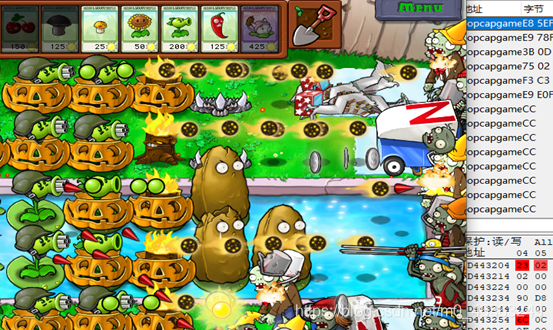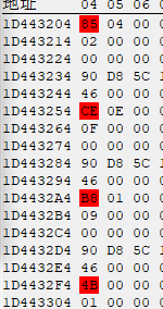我们可以发现当我们种下樱桃炸弹之后,地址1D443204后面的数值发现了变动,我们这里可以确定刚才找的没错 (3)现在要找其他几个植物了,先看看上面的内存区域,然后种下在卡槽中樱桃炸弹后面的毁灭菇,看看有没有区域数值发生了变化,操作过后如下图: