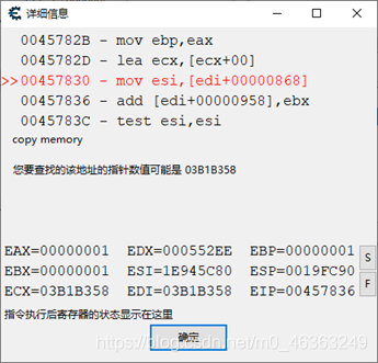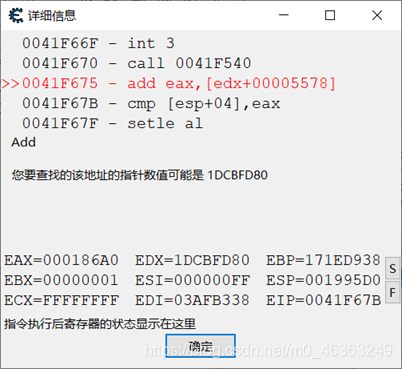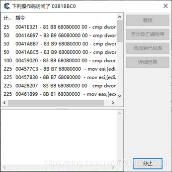您查找的地址指针数值可能是这个,复制这个值,然后回到CE中搜索,出现很多个值,然后我们要挨个查看什么访问了这个地址,直到出现如下图一样有规律的为止,还是点击详细信息