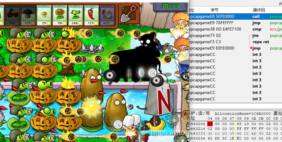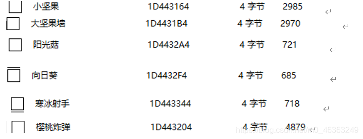 (4)我们看到刚才的樱桃位置1D443204下面的1D443254后面的数值发生了变化,我们可以猜测这个就是毁灭古的位置,并且得知,每隔5个位置就是一个卡槽植物的冷却时间,我们来验证一下,种下其他植物验证一下。