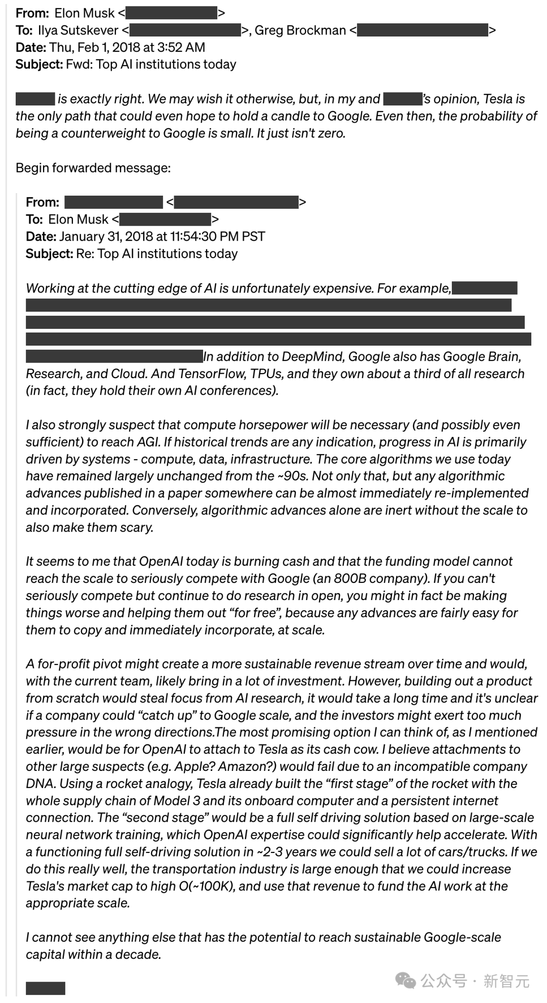 向Sutskever和Brockman发送的邮件中,马斯克称: