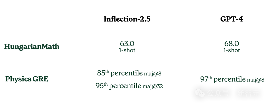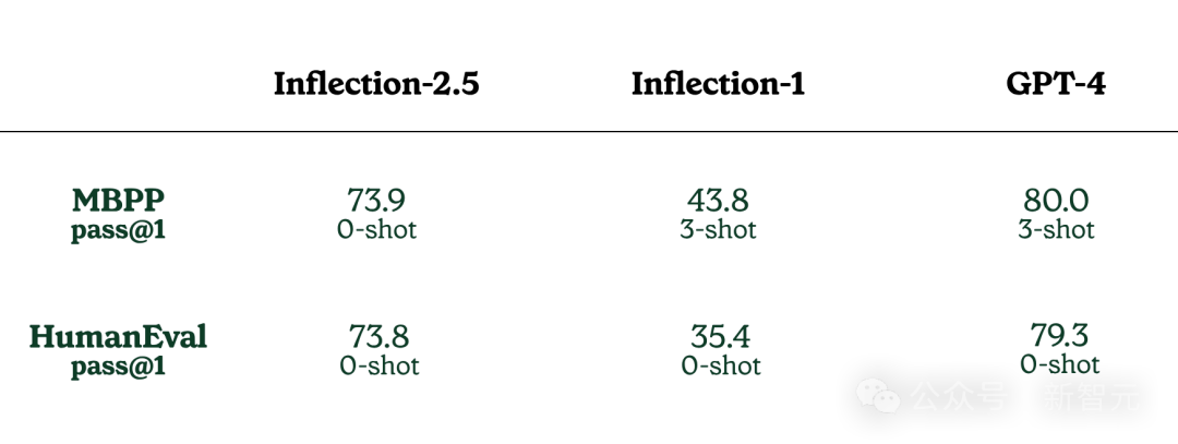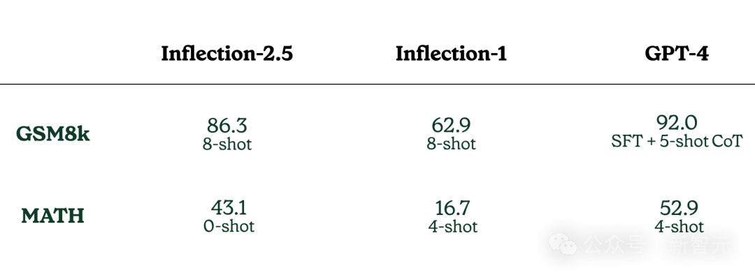 从下面的数据对比中可以看到,Inflection-2.5在数学和编程方面的能力,相比起初代Inflection-1有了显著的提升。