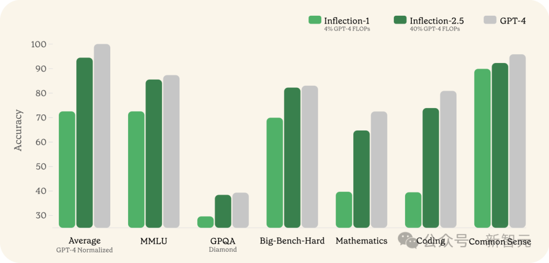 此前,Inflection-1凭借着4%的训练FLOPs,在多项以智力为核心的任务上,达到了GPT-4水平的72%。