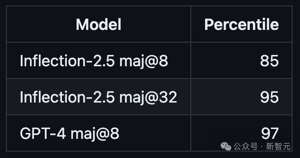 可以看到,在maj@8的评分标准下,Inflection-2.5的表现达到了所有参考人群的第85百分位,在maj@32的评分标准下,其成绩几乎拿到了95百分位的高分。