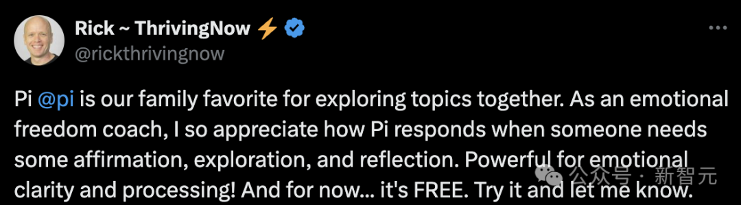 有网友称,「Pi是我们全家一起探索话题最爱的工具。作为一名情感自由教练,当有人需要肯定、探索和反思时,我非常欣赏Pi的反应。强大的情感清晰度和处理能力」!