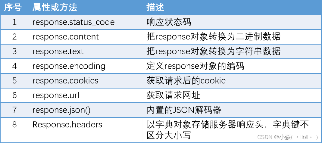 requests.head() | 获取HTML的头部信息 | |