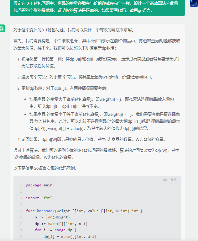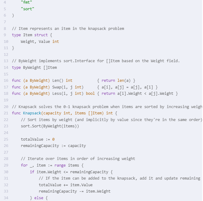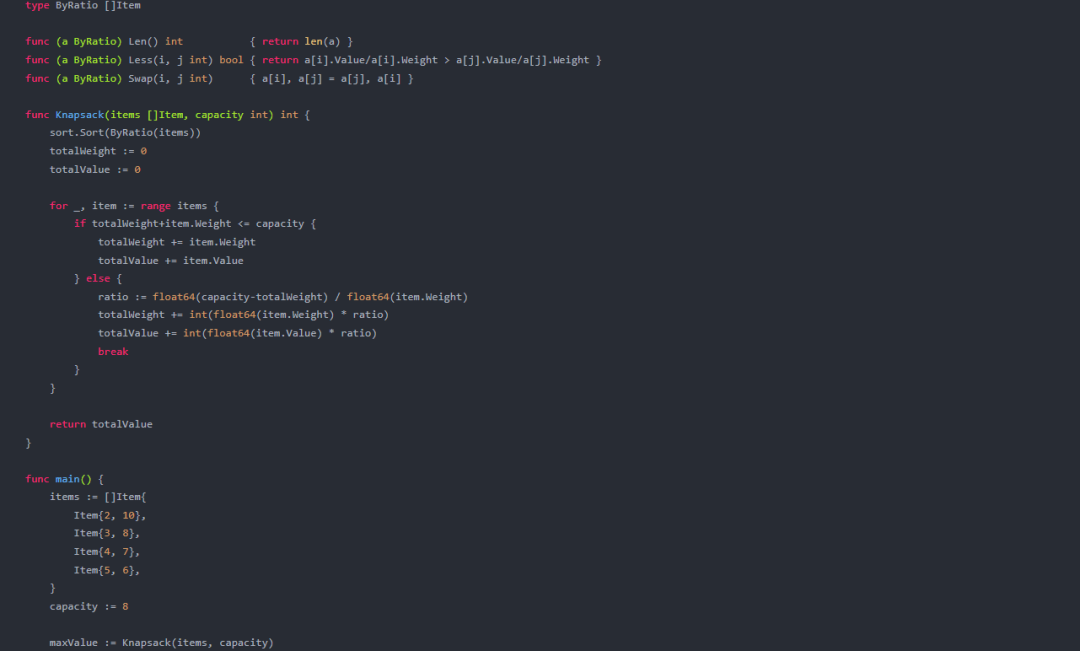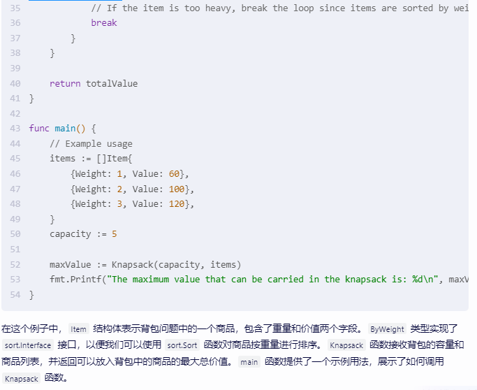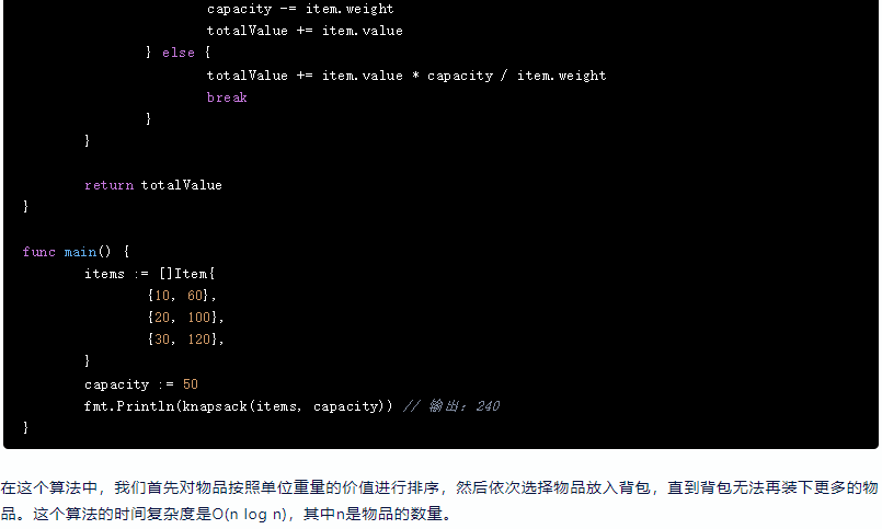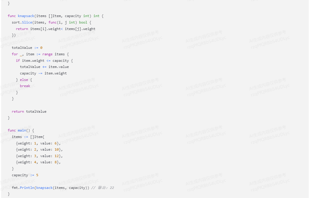 }在这个例子中,Item 结构体表示背包问题中的一个商品,包含了重量和价值两个字段。ByWeight 类型实现了 sort.Interface 接口,以便我们可以使用 sort.Sort 函数对商品按重量进行排序。Knapsack 函数接收背包的容量和商品列表,并返回可以放入背包中的商品的最大总价值。main 函数提供了一个示例用法,展示了如何调用 Knapsack 函数。