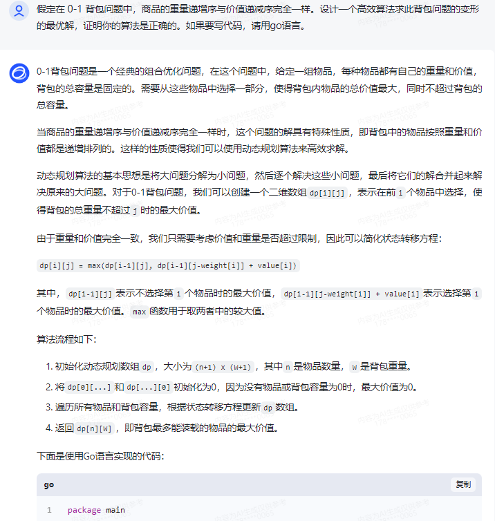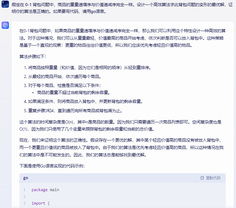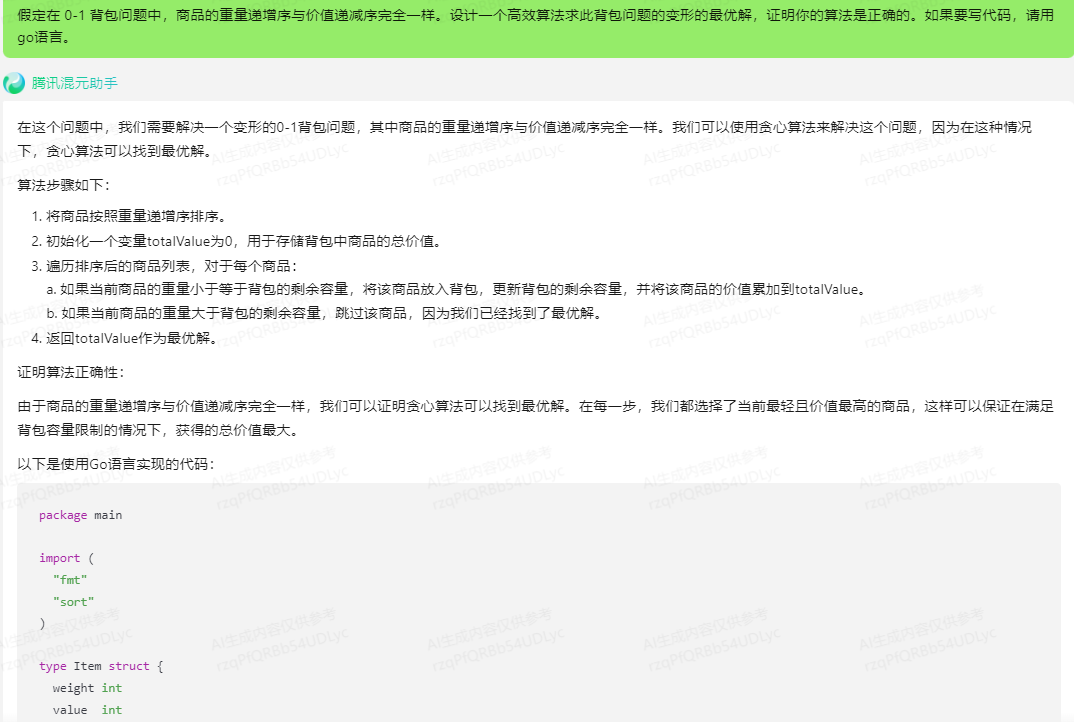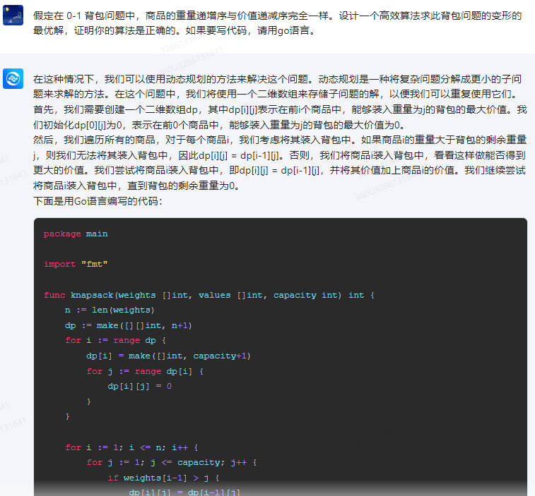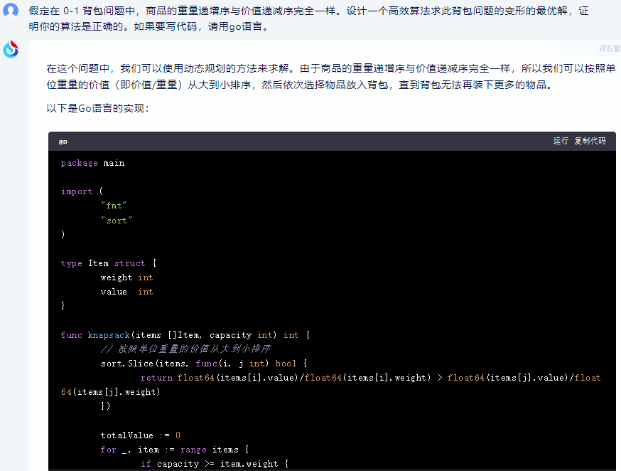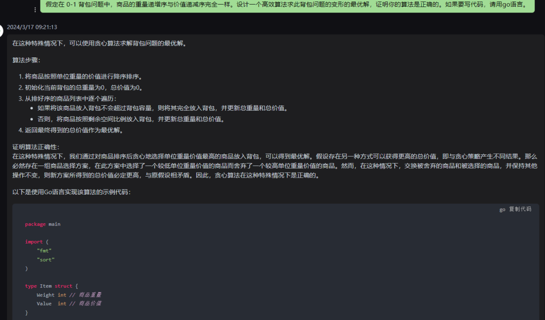 }在这个例子中,Item 结构体表示背包问题中的一个商品,包含了重量和价值两个字段。ByWeight 类型实现了 sort.Interface 接口,以便我们可以使用 sort.Sort 函数对商品按重量进行排序。Knapsack 函数接收背包的容量和商品列表,并返回可以放入背包中的商品的最大总价值。main 函数提供了一个示例用法,展示了如何调用 Knapsack 函数。
