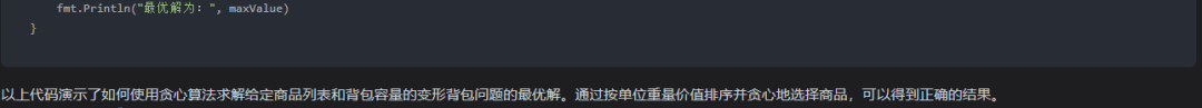 }以上代码演示了如何使用贪心算法求解给定商品列表和背包容量的变形背包问题的最优解。通过按单位重量价值排序并贪心地选择商品,可以得到正确的结果。