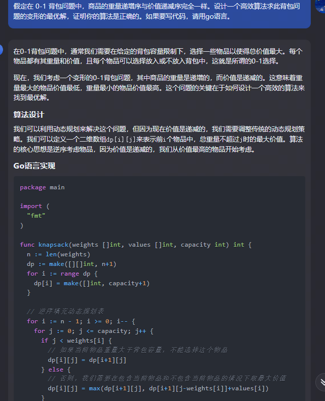 }以上代码使用动态规划的思想来解决变形的0-1背包问题,并输出最大价值。证明算法的正确性可以通过数学归纳法或者举例进行验证,这里就不再展开证明了。