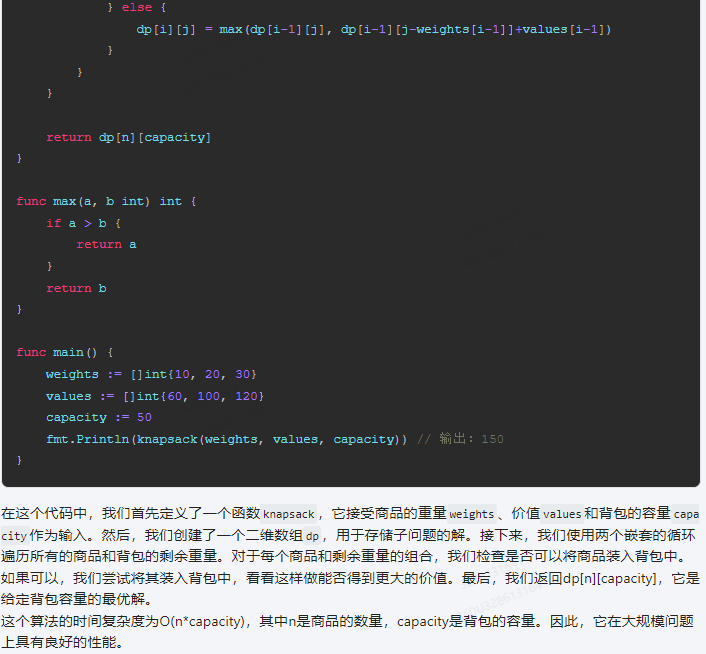 fmt.Println(knapsack(weights, values, capacity)) // 输出:150