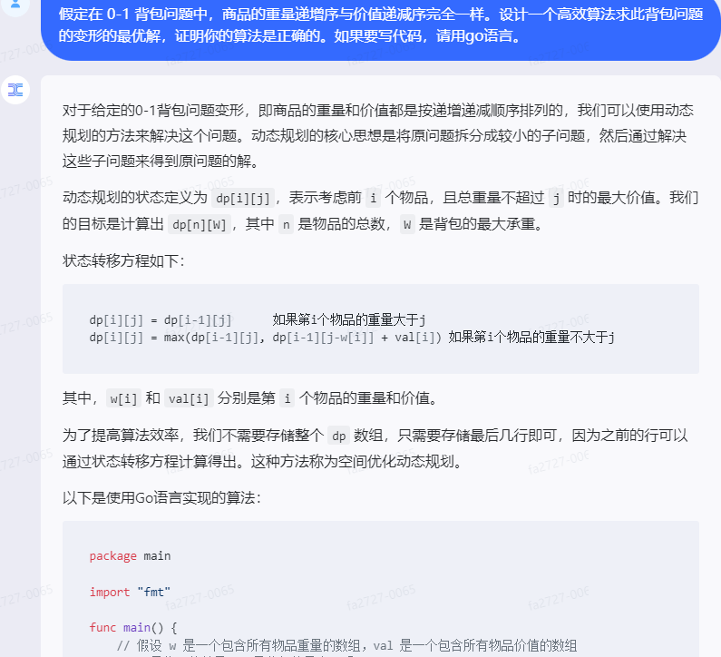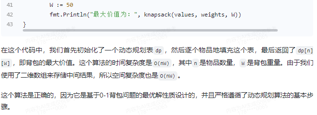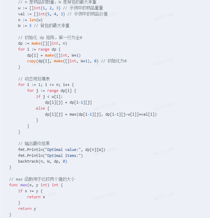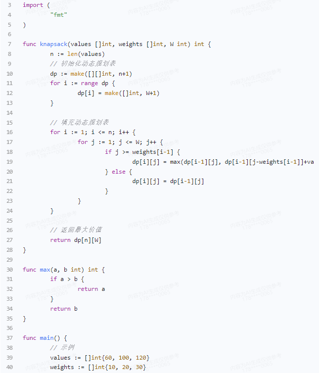 dp,大小为(n+1) x (W+1),其中n是物品数量,W是背包重量。dp[0][...]和dp[...][0]初始化为0,因为没有物品或背包容量为0时,最大价值为0。dp数组。dp[n][W],即背包最多能装载的物品的最大价值。 下面是使用Go语言实现的代码:package main