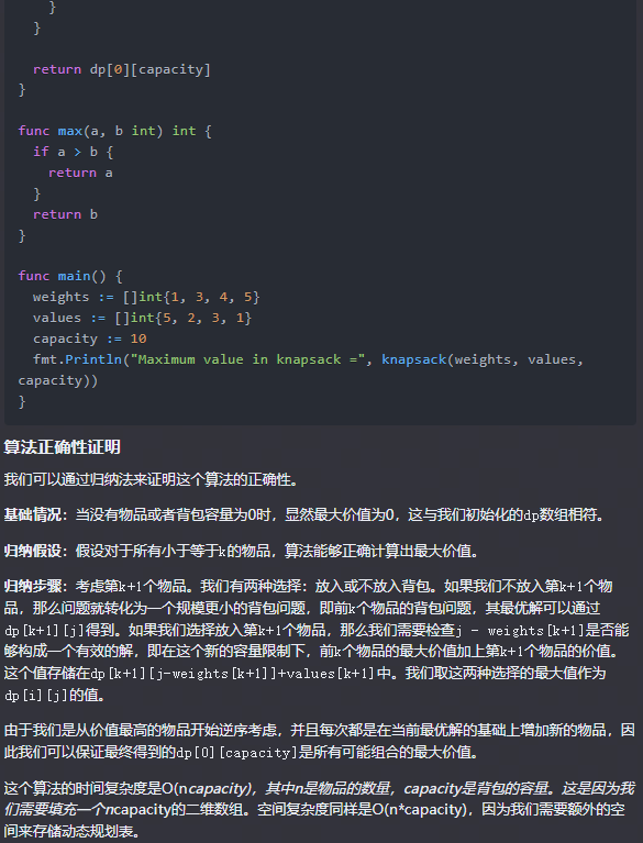 fmt.Println(knapsack(items, capacity)) // 输出:240