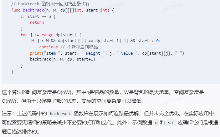 注意:上述代码中的 backtrack 函数旨在展示如何追踪最优解,但并未完全优化。在实际应用中,可能需要更精细的策略来减少不必要的打印和迭代。此外,示例数据 w 和 val 应确保它们是根据题目描述排序的。