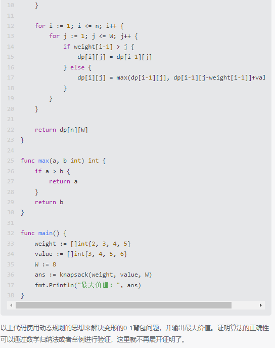 fmt.Println(knapsack(items, capacity)) // 输出:22