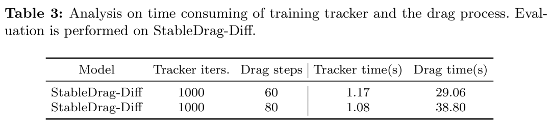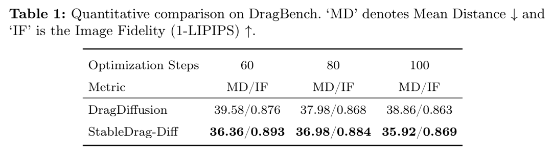 如下表 1 所示,在 3 种不同的优化步骤设置下,StableDrag-Diff 始终能够优化 DragDiffusion。