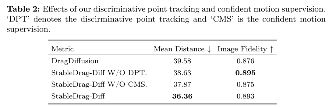 其次是判别点跟踪。图 7 和表 2 评估了 StableDrag 和没有判别跟踪模型的 StableDrag。我们可以看到,没有判别跟踪模型的 StableDrag 可能会受到背景干扰点的误导,导致结果不准确。