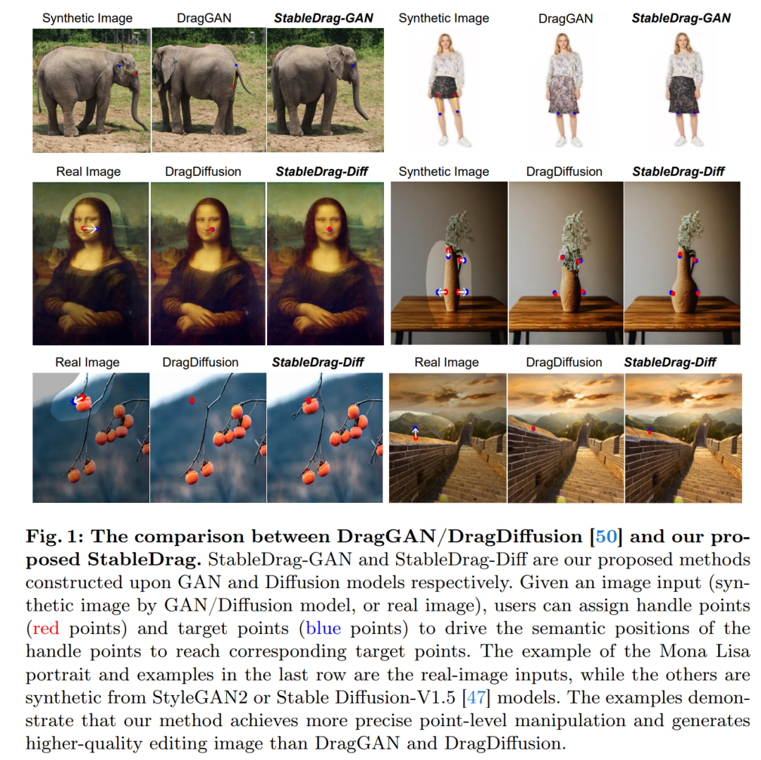 如图 1 所示,由于不精确的点跟踪和不完整的动作监督,DragGAN 和 DragDiffusion 对图像的编辑质量不高。因此,在这项工作中,本文将注意力集中在当前的拖拽技术上,以实现更稳定和更精确的图像操作。
