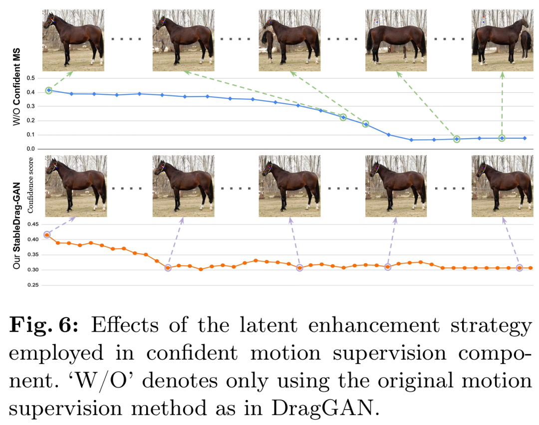 首先是置信动作监督。研究者首先进行了基于 StableDrag-GAN 的马编辑实验,如下图 6 所示,随着置信度得分逐渐降低,没有置信度动作监督模块的 StableDrag 编辑的图像质量较低。